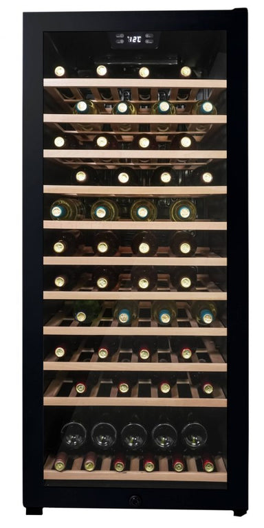 Features Extra large capacity single zone wine cooler stores and preserves up to 94 bottles of your favorite vintages Contemporary all black fa...